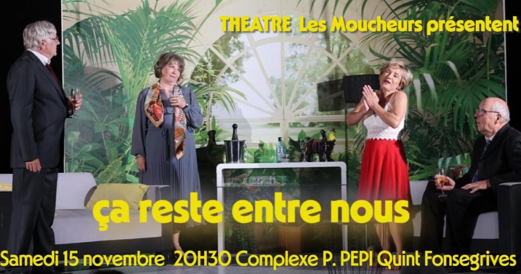 Théâtre - Les Moucheurs Théâtre Les Moucheurs « ça reste entre nous » Samedi 15 Novembre 2025 Quint-Fonsegrives Publié le 27 octobre 2025 27 octobre 2025 Nouvelle représentation de notre pièce de 2023 dans le cadre d’un échange avec la section Théâtre du foyer Rural de Quint-Fonsegrives