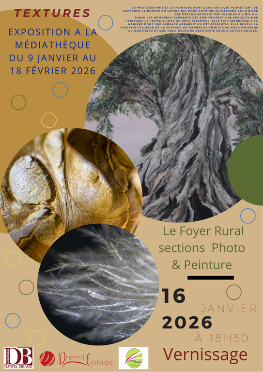 L’atelier Peinture-Vitrail et la section Photo présentent une exposition de tableaux et de photographies à la médiathèque de Drémil-Lafage.du 10 janvier au 18 février 2026 aux heures d’ouverture au public de la médiathèque.