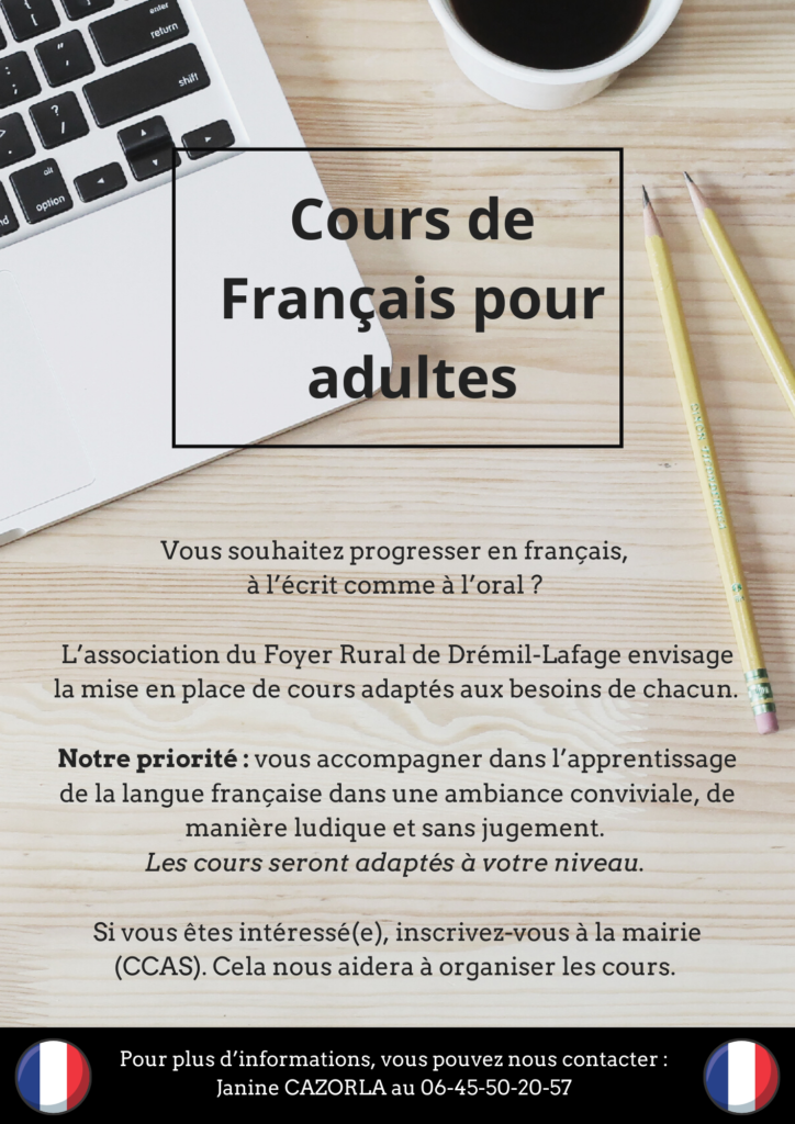 Une nouvelle section en préparation : Cours de français pour adulte Publié le 24 février 2026 24 février 2026 Vous souhaitez progresser en français à l’écrit comme à l’oral ? Le Foyer Rural de Drémil-Lafage envisage la mise en place de cours adaptés aux besoin de chacun. Si vous êtes intéressé(e), contacter Janine Cazorla au 06 45 50 20 57